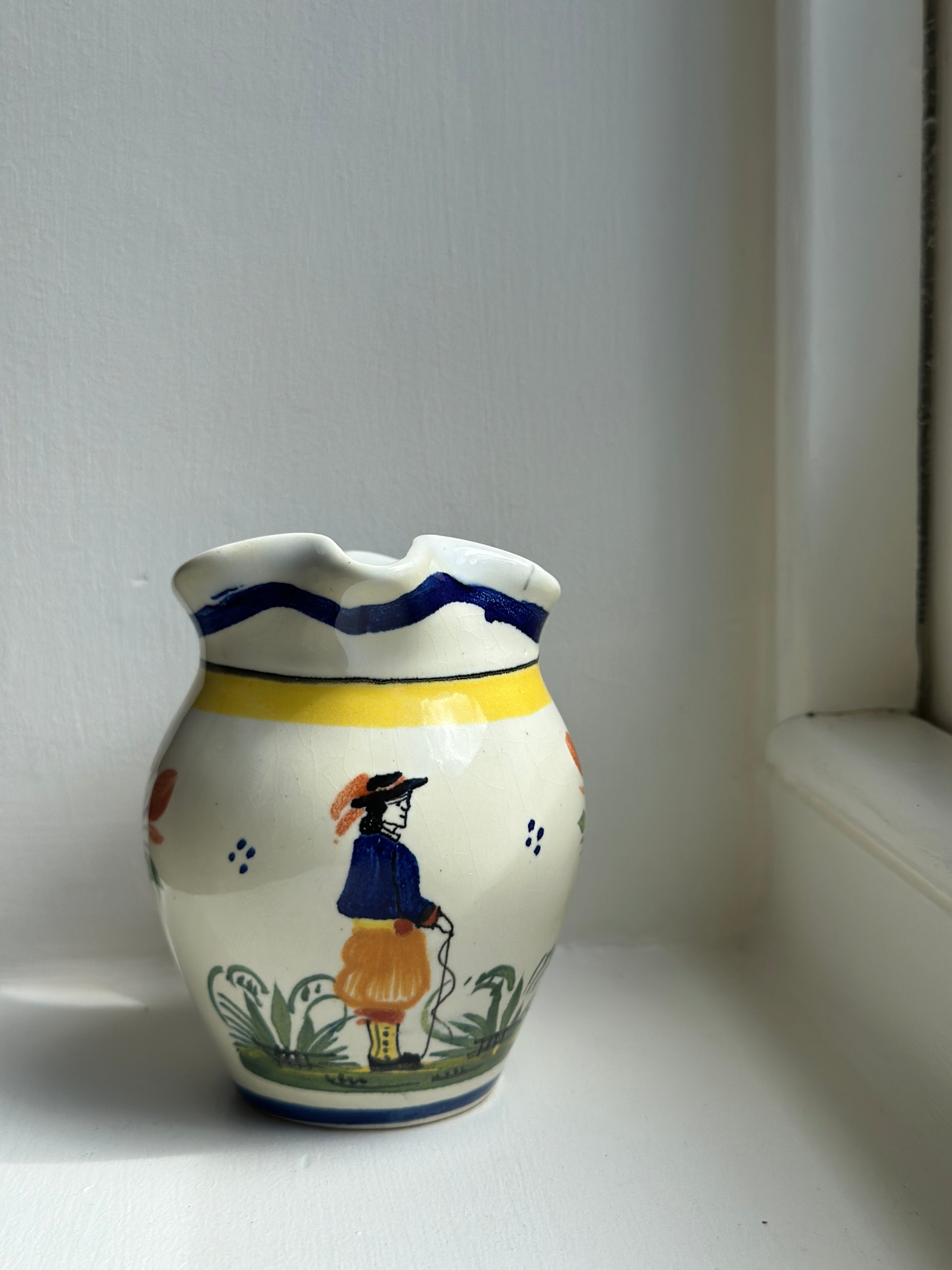 A delightful little treasure with a hand-painted figure and soft, timeworn charm. Its gentle glaze and cheerful colors tell stories of cozy breakfasts and long afternoon teas. The wavy rim and delicate brushstrokes make it feel wonderfully personal — like something passed down through generations. It’s the perfect touch of rustic warmth for your kitchen shelf or breakfast table.